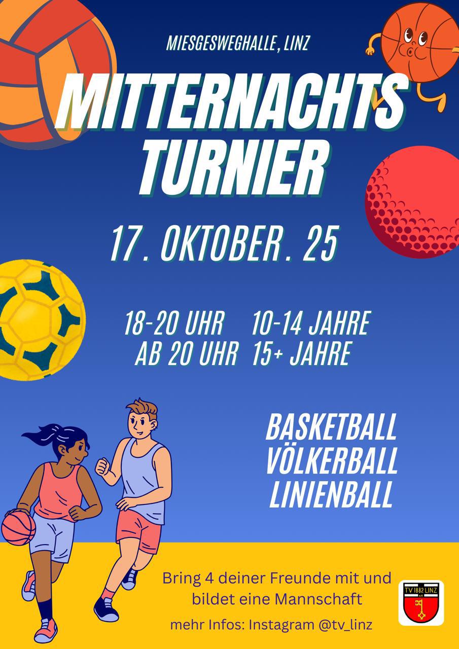 Am 17.10.2025 lädt der TV Linz zum ersten Mitternachts-Turnier in die Sporthalle am Miesgesweg ein. Los geht es ab 18:00 Uhr mit einem Turnier für Kinder von 10 bis 14 Jahren. Ab 20:00 Uhr sind dann Jugendliche ab 15 Jahren eingeladen sich in den Spielen Basketball, Völkerball und Linienball zu messen.